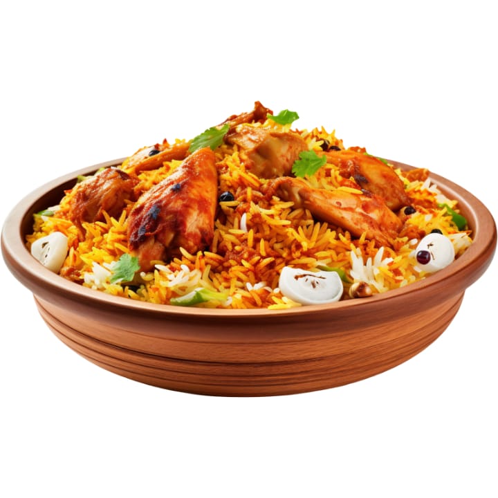 Richly flavored aromatic rice and marinated chicken cooked in dum-style in a flavored Zafran